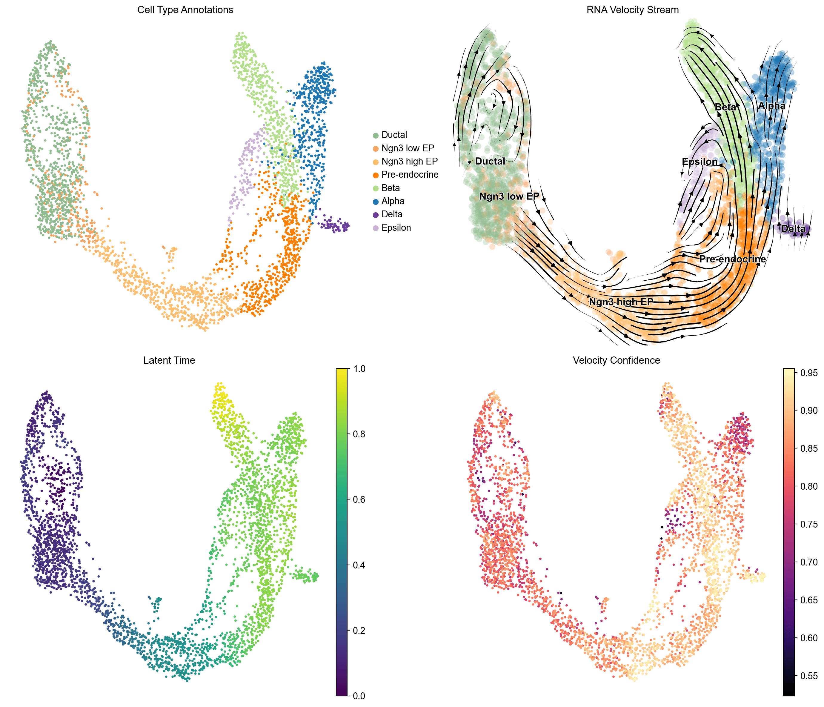 The differentiation is hierarchical and largely irreversible. RNA velocity vectors are consistently directed from progenitors toward terminal states, with no evidence of retrograde flow. The latent time gradient is smooth and monotonic, supporting a well-ordered temporal progression through Ductal, Ngn3 low/high EP, Pre-endocrine, and terminal endocrine states.