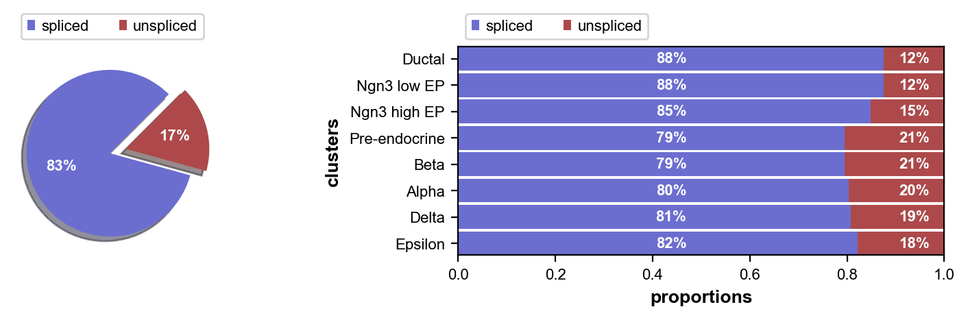 Unspliced fractions range from 12% (Ductal) to 21% (Pre-endocrine, Beta), with Pre-endocrine and Beta cells showing the highest transcriptional turnover rates