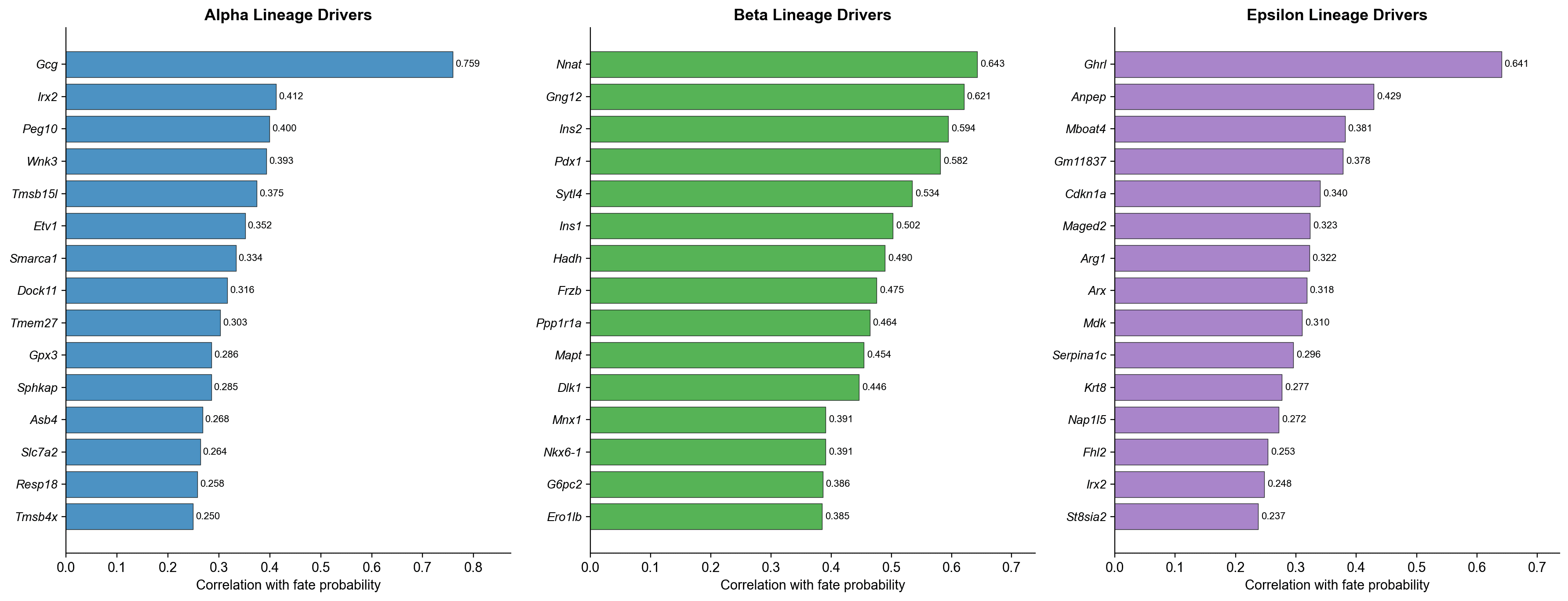 Alpha | Gcg (r=0.759), Irx2 (r=0.412), Peg10 (r=0.400), Etv1 (r=0.352) | Glucagon is the defining Alpha hormone; Irx2 is a known Alpha cell TF |