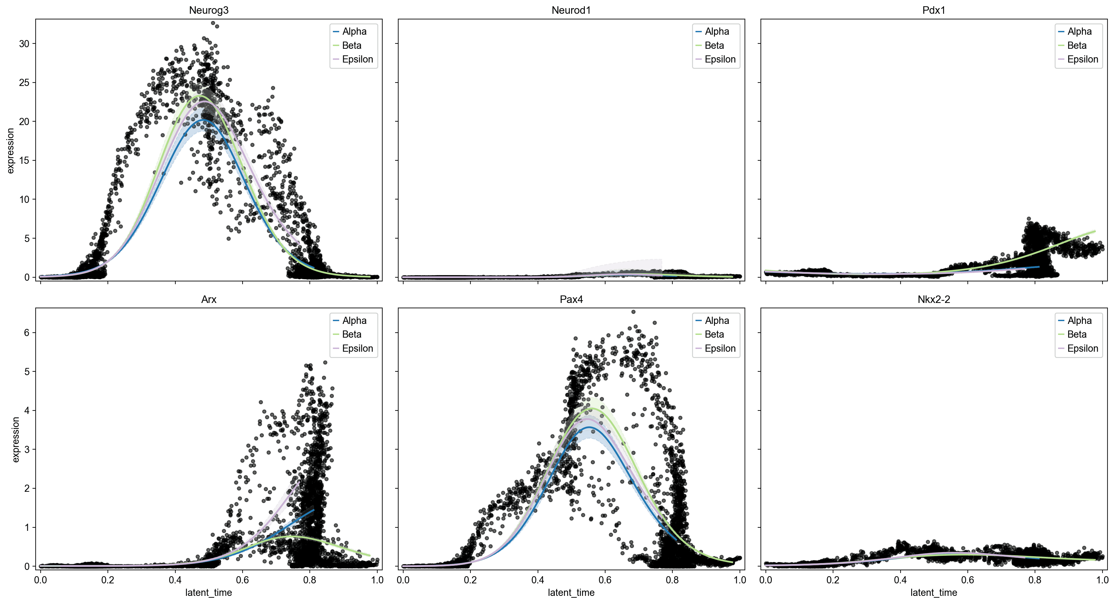 Arx shows Alpha-lineage-specific late upregulation (latent time >0.6), consistent with its role as an Alpha cell fate determinant; the Alpha trend line diverges markedly from Beta/Epsilon at this point .