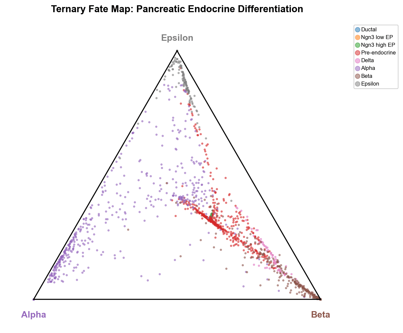 The simplex projection places mature Alpha, Beta, and Epsilon cells at their respective vertices, while Pre-endocrine cells form a central stream that branches toward each terminal fate. Delta cells cluster near the Beta vertex along the Alpha-Beta edge, reinforcing their Beta-lineage proximity