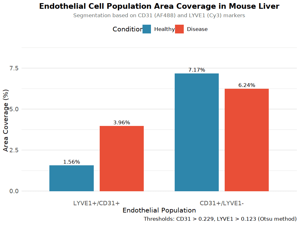 Segmentation was performed using Otsu's automatic thresholding method (CD31 threshold = 0.229, LYVE1 threshold = 0.123). Binary masks were combined to define two endothelial populations: LYVE1+/CD31+ (double-positive) and CD31+/LYVE1- (CD31 only).