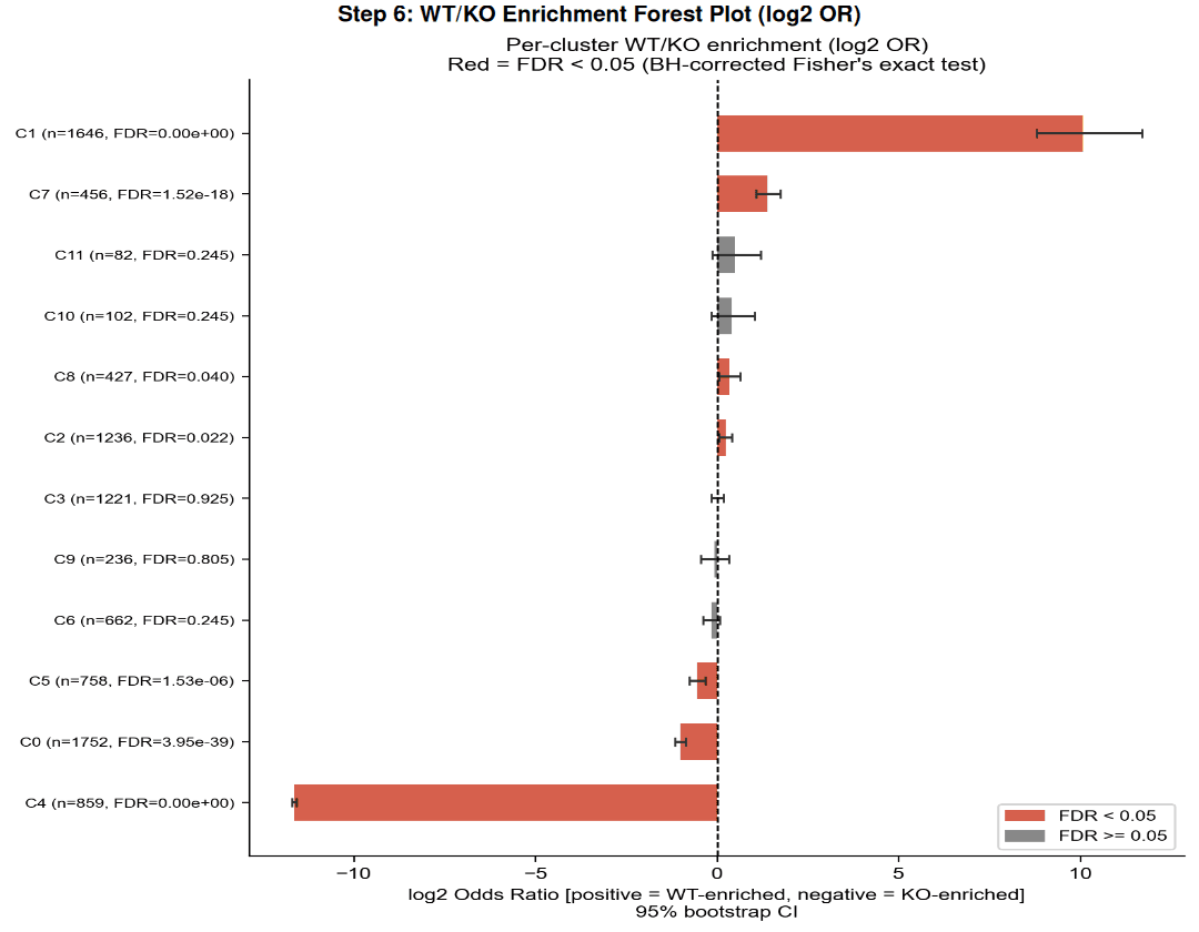 Cluster | n_WT | n_KO | % WT | log2 OR | 95% CI | FDR |