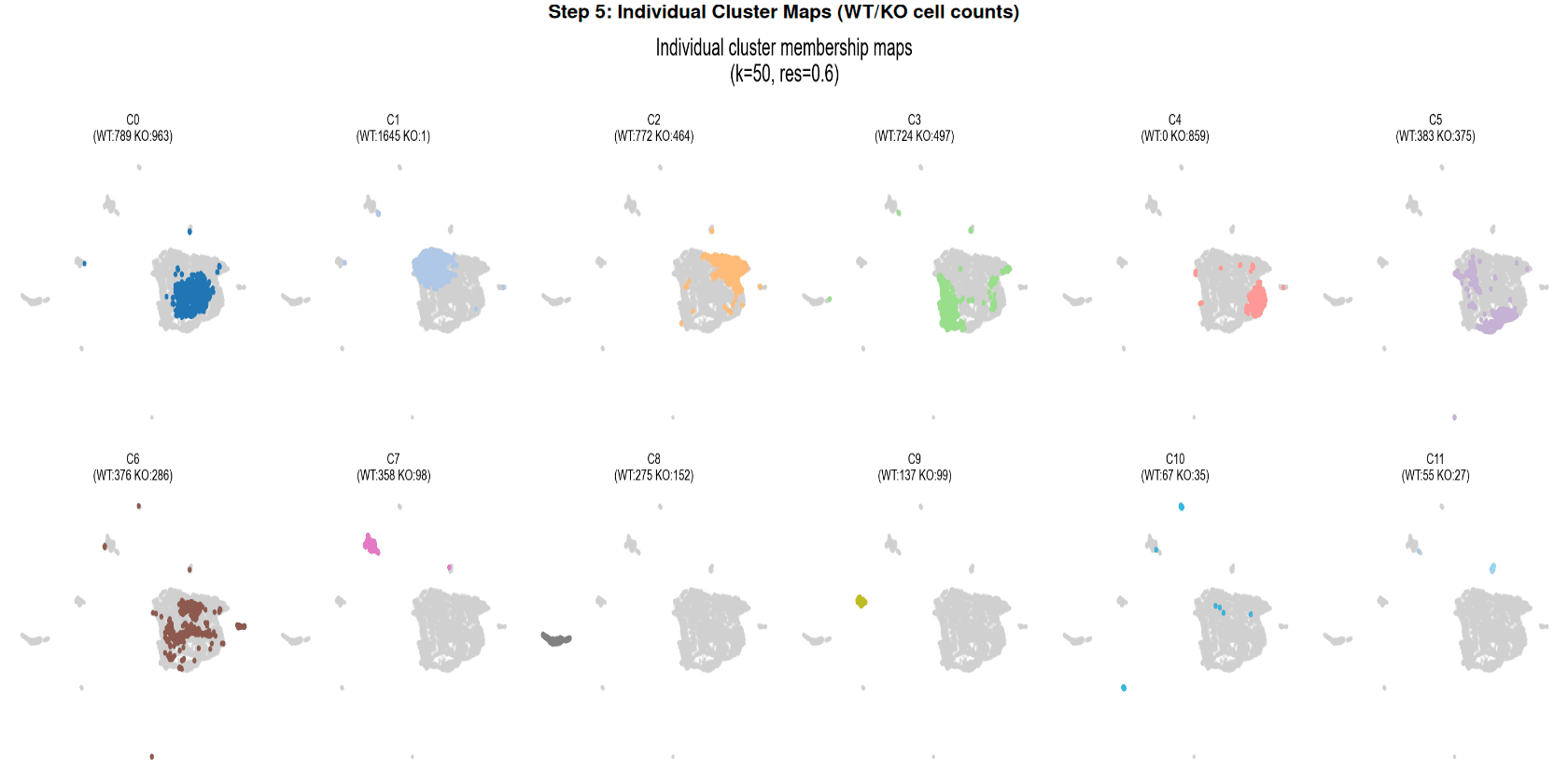 The extreme bimodal genotype segregation — with KO cells completely excluded from C1 and shunted into C4 — demonstrates that HOX13 loss does not uniformly perturb all cell states but instead prevents cells from accessing the digit-specific chromatin program and diverts them into an aberrant KO-specific configuration . The original paper explicitly noted that "chromatin accessibility did not simply switch to a proximal limb bud profile," consistent with the observation here that C4 is a distinct state rather than a simple reversion.